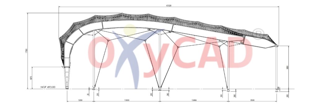 Etude : Cette étude à consister à la conception 3d d’une structure métallique composée de trois méga-poudres large de 47 m suspendues uniquement aux extrémités (voir image ci-dessous) :